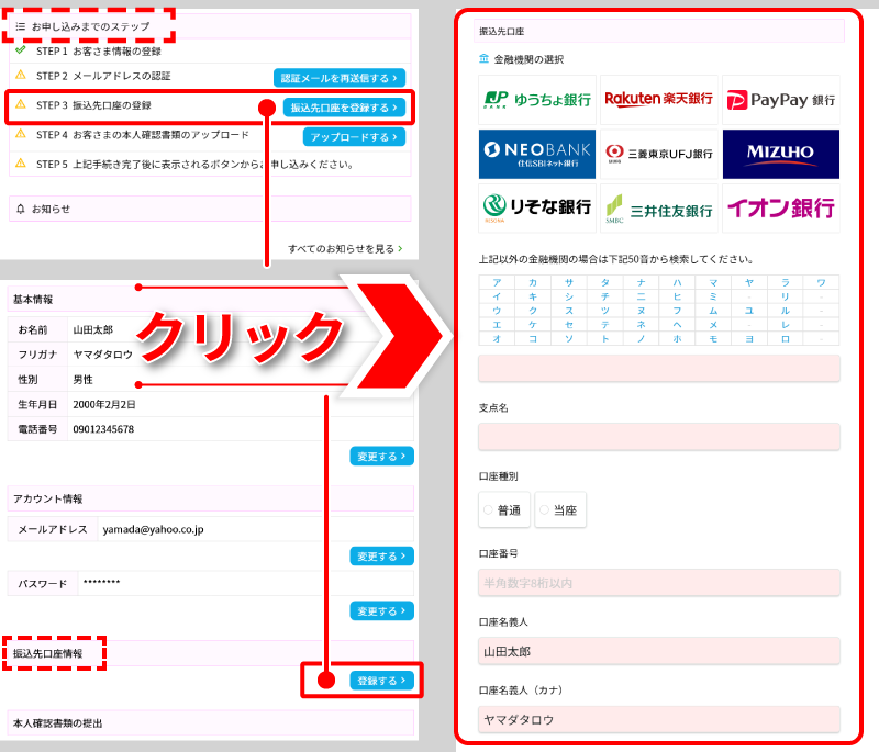 まずはマイページトップの「お申し込みまでのステップ」または「お客さま情報」ページにあるリンクから、振込先口座の登録ページへアクセスしてください。