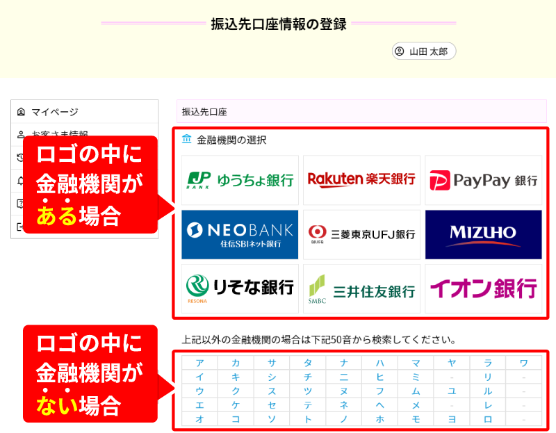 上部に表示されているロゴの中にご利用の金融機関がある場合は、対象のロゴをクリックしてください。ロゴがない場合には下部の50音表から検索することができます。