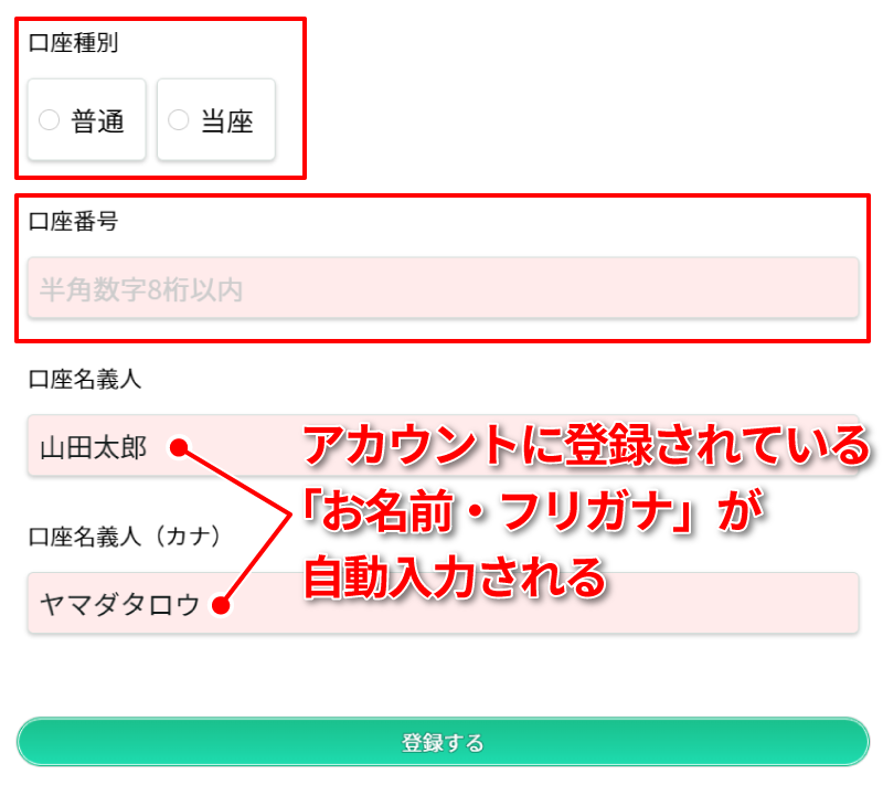 「口座名義人」にはアカウントに登録されている「お名前・フリガナ」が自動入力されます。