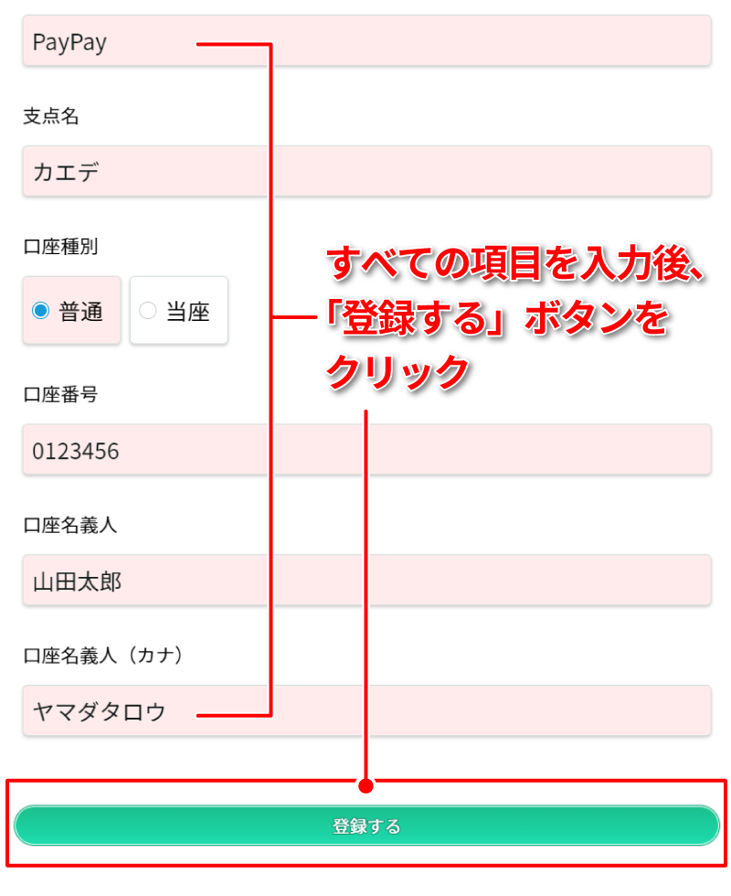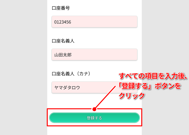すべての項目を入力後、「登録する」ボタンをタップすれば振込先口座の登録が完了します。