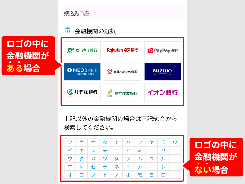 上部に表示されているロゴの中にご利用の金融機関がある場合は、対象のロゴをタップしてください。ロゴがない場合には下部の50音表から検索することができます。